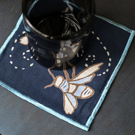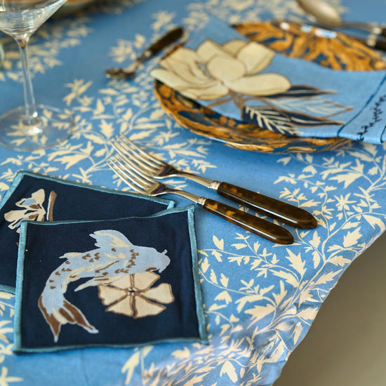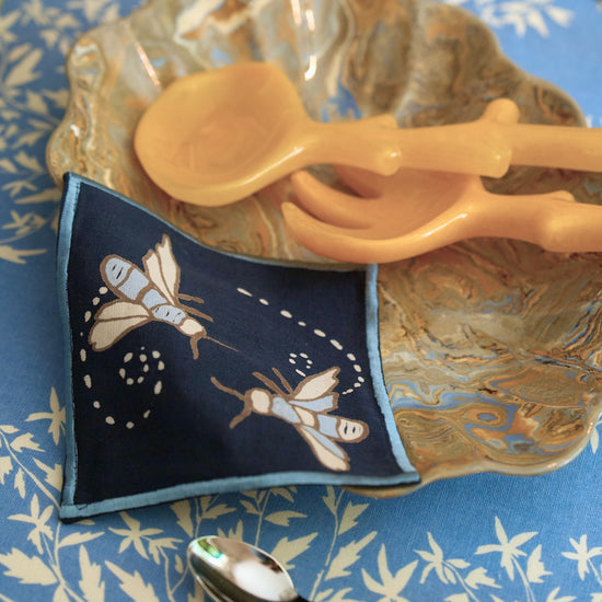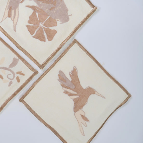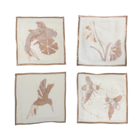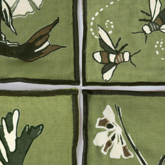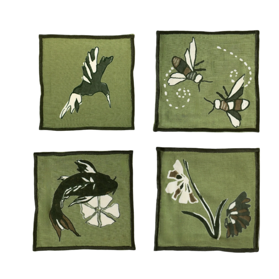 Our Flora & Fauna cocktail napkins include elements pulled out from the Maravilla Tablecloth design: the Marigold, Hummingbird, Bumblebee, and Koi fish. The perfect drink markers, these cocktail napkins add a fun addition to any soiree. Sold is sets of 4 and in Pine, Ecru, and Woodsy.