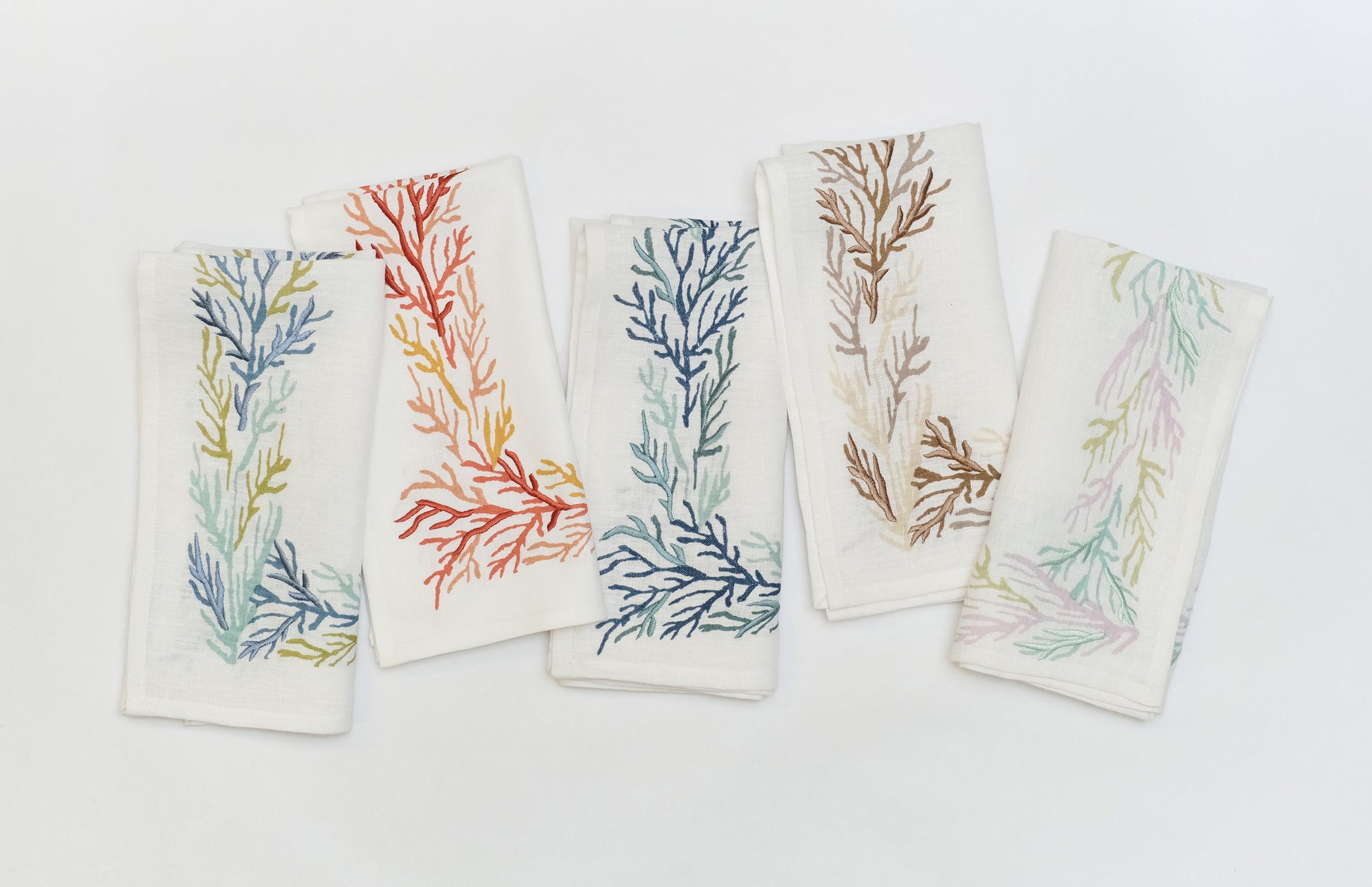 Meet Lorient! Bring a bit of the beach to your table with our hand-embroidered coral napkin. Crafted from high quality 100% linen and detailed with delicate reef-inspired embroidery, this napkin blends refined coastal charm with timeless craftsmanship.