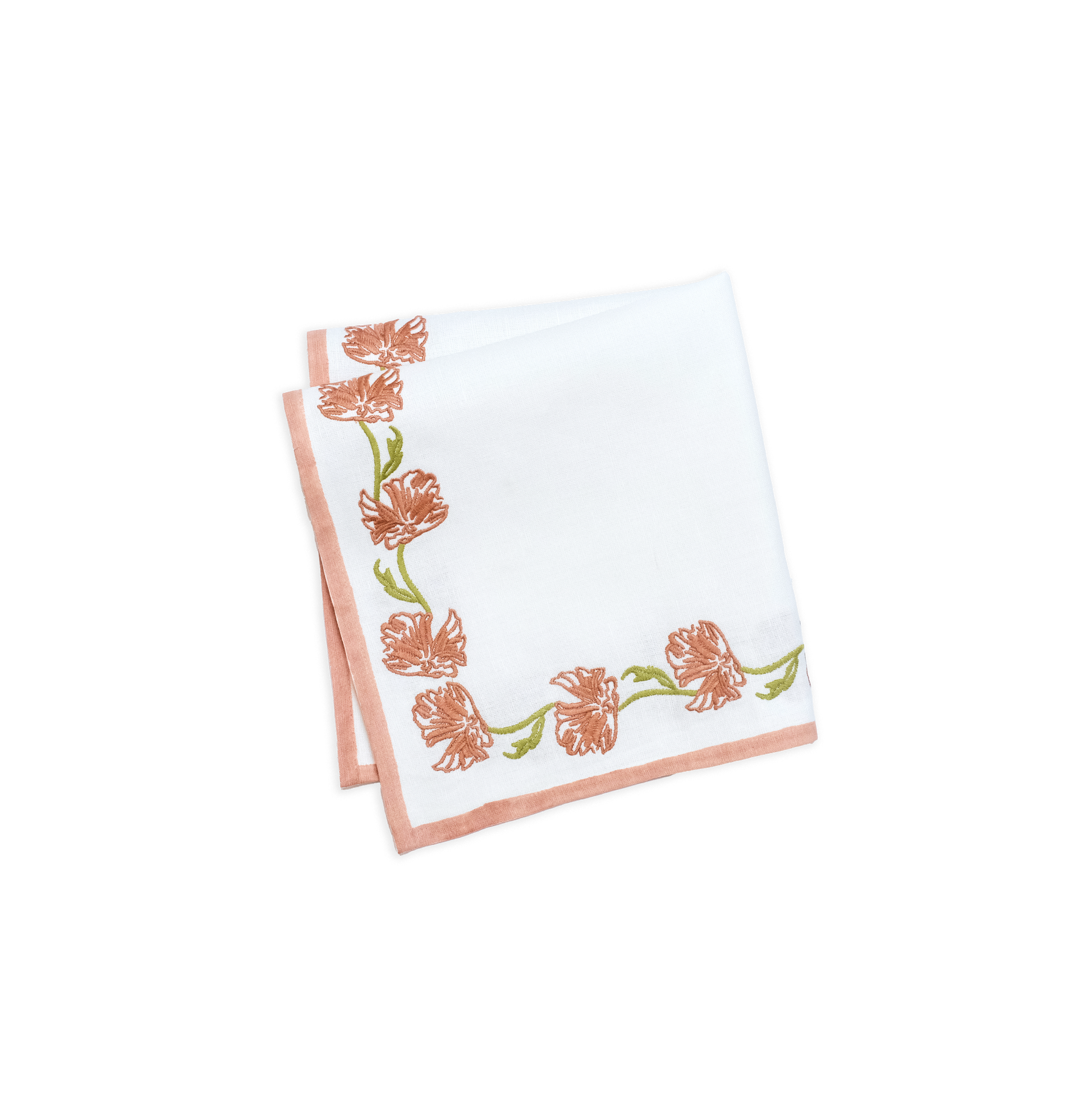 Our Blossom embroidered napkin features a poppy flower in bloom, dancing along the trim of the 20x20'' napkin. The block printed trim in coral adds a hand printed touch. Coordinate these napkins with our Poppy, Primrose, or Tuileries Tablecloth.