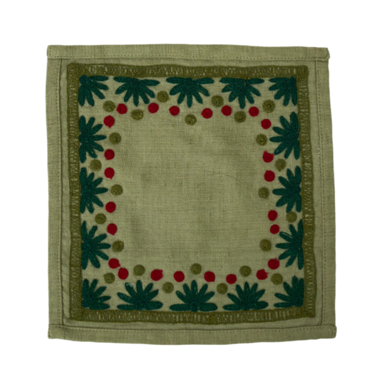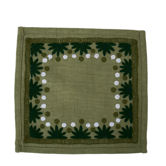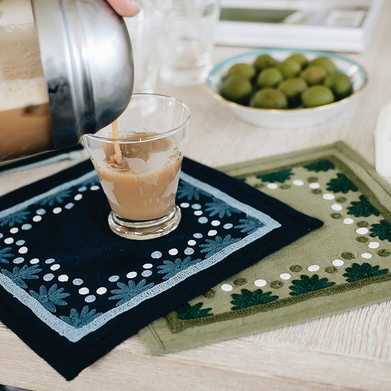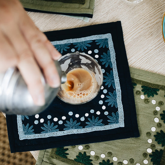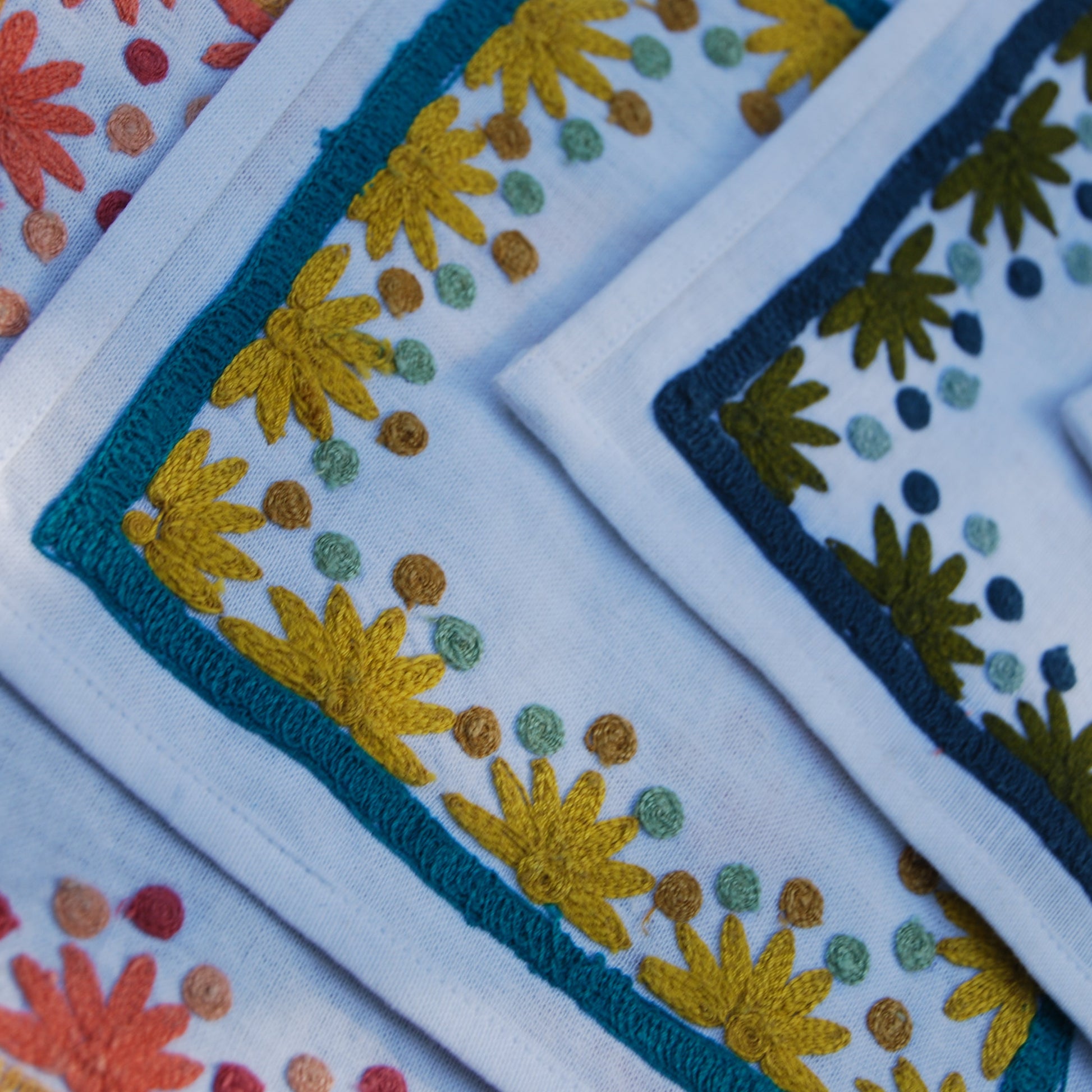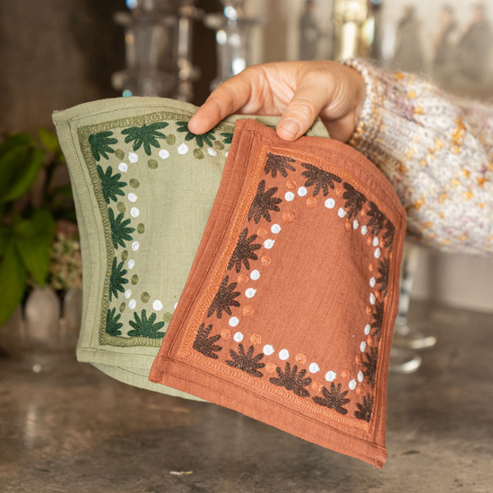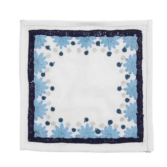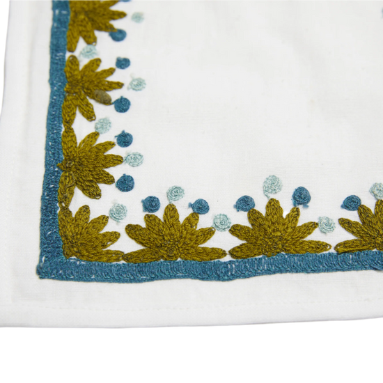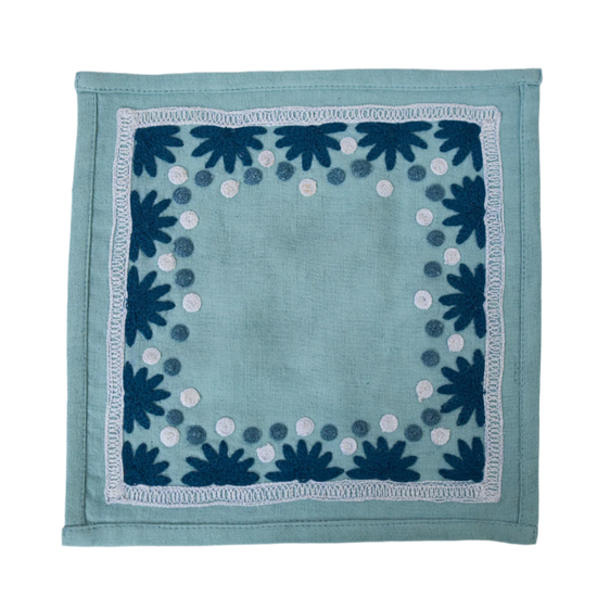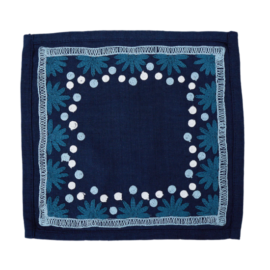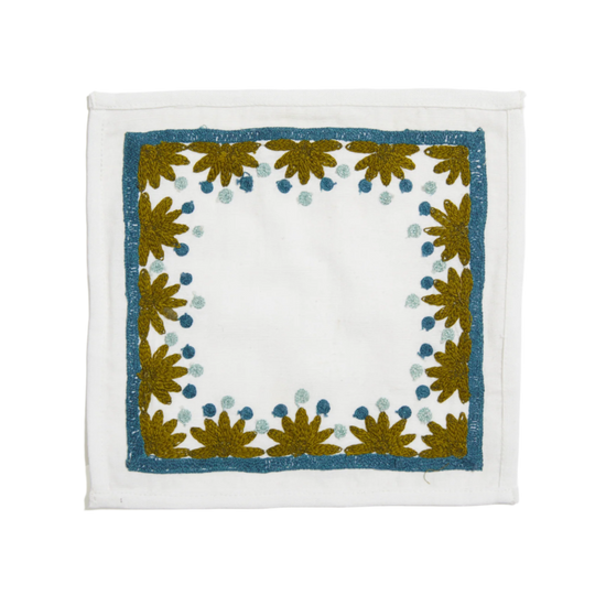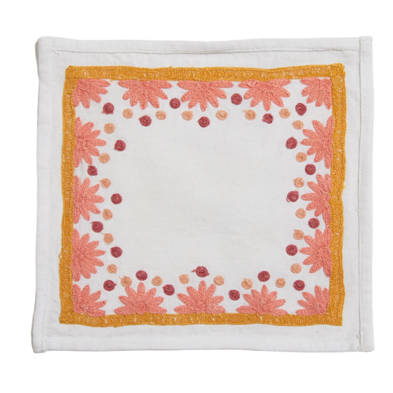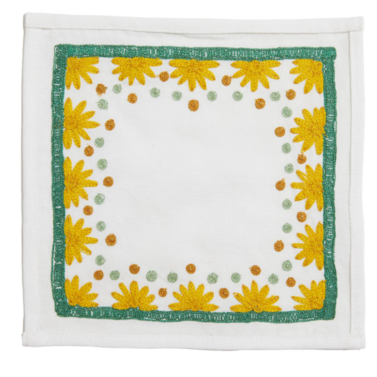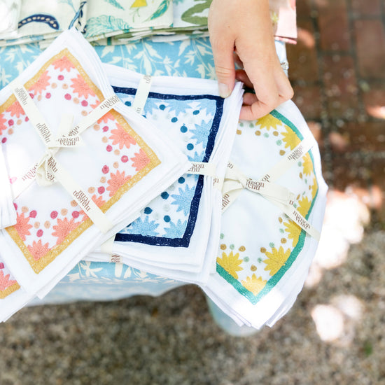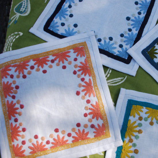 Our first cocktail napkin! Our Starburst design is created using an artisanal chain stitch embroidery technique. This embroidery resembles the techniques used to create original Suzani textiles. Colorful and sophisticated, our Starburst cocktail napkin add a punch of color to any summer table.
