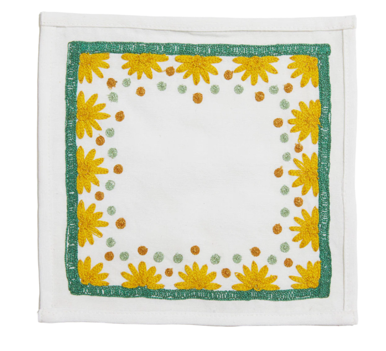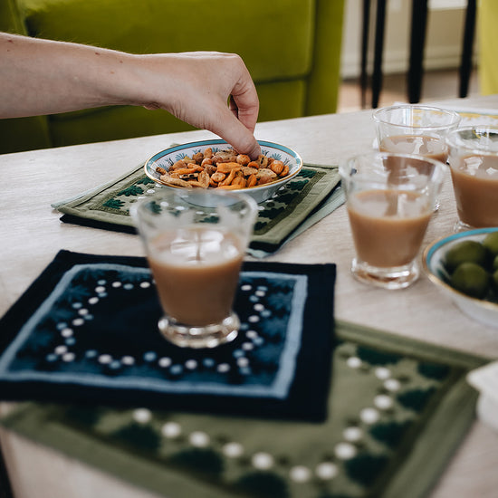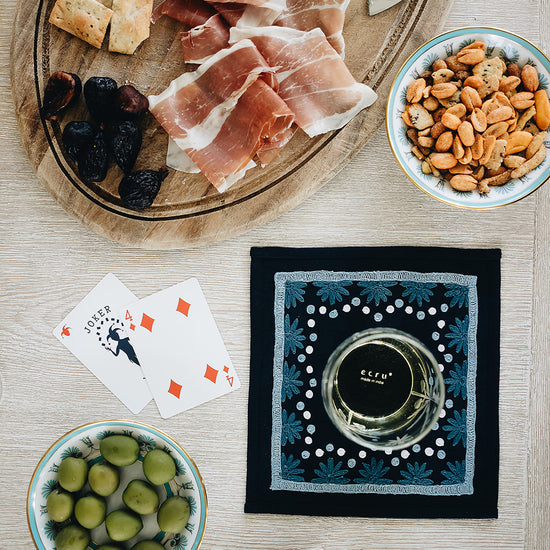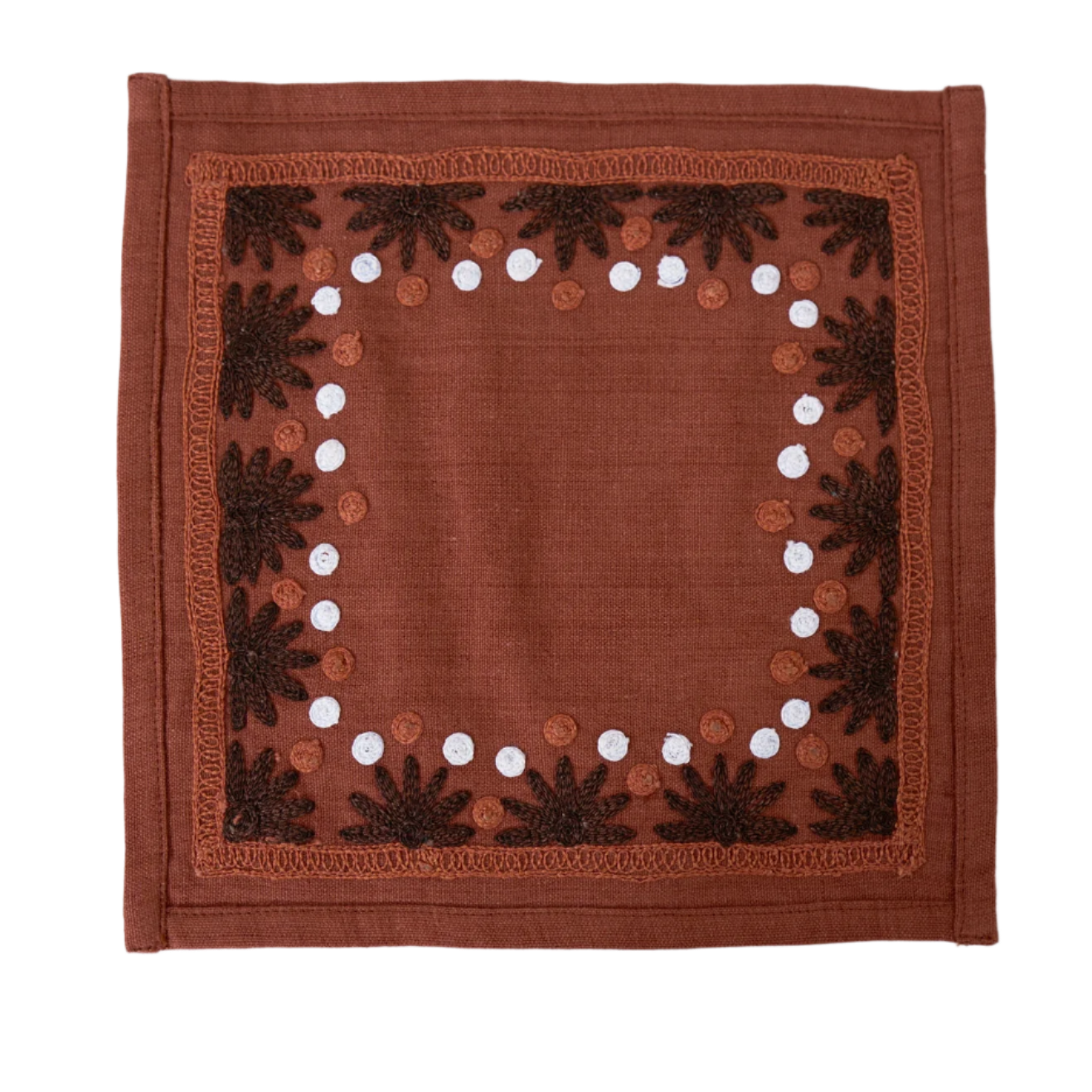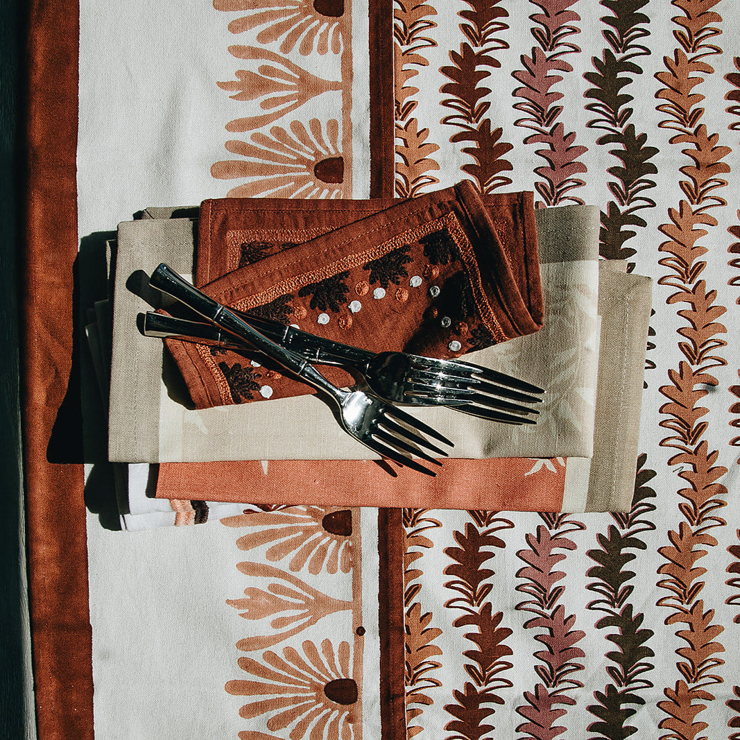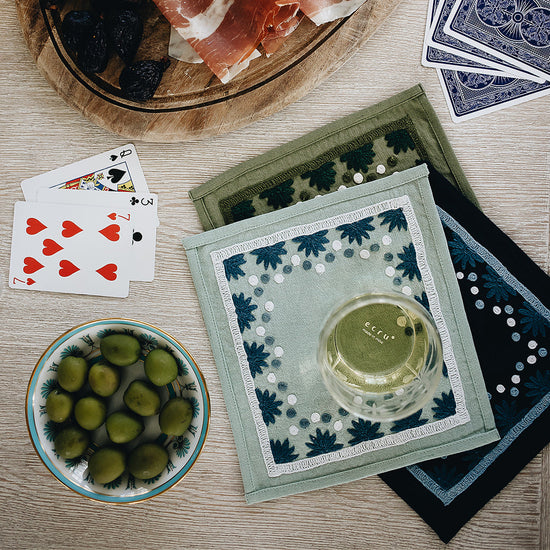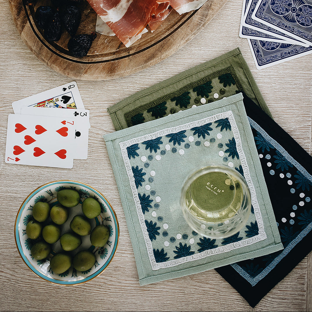 Our first cocktail napkin! Our Starburst design is created using an artisanal chain stitch embroidery technique. This embroidery resembles the techniques used to create original Suzani textiles. Colorful and sophisticated, our Starburst cocktail napkin add a punch of color to any summer table.