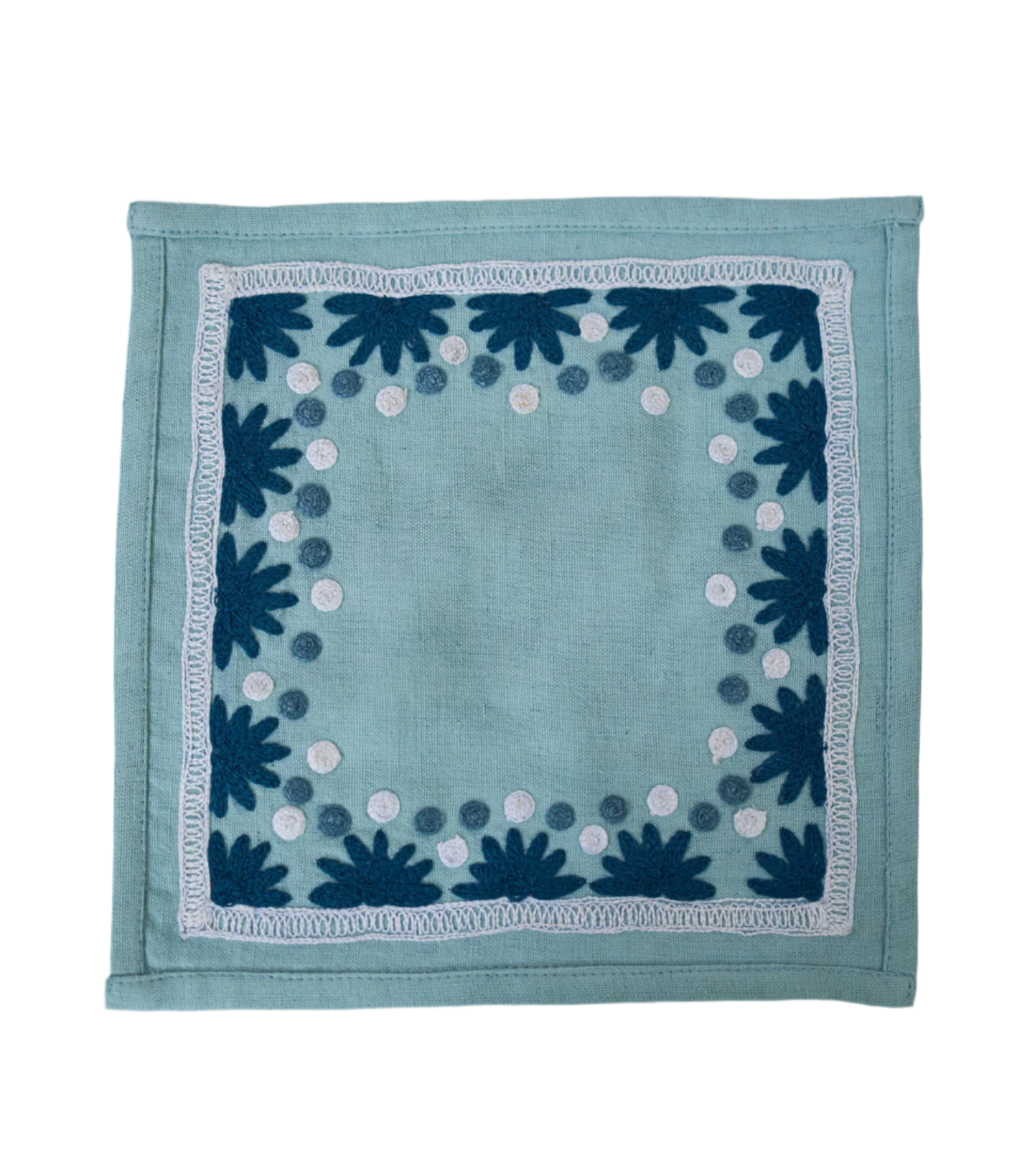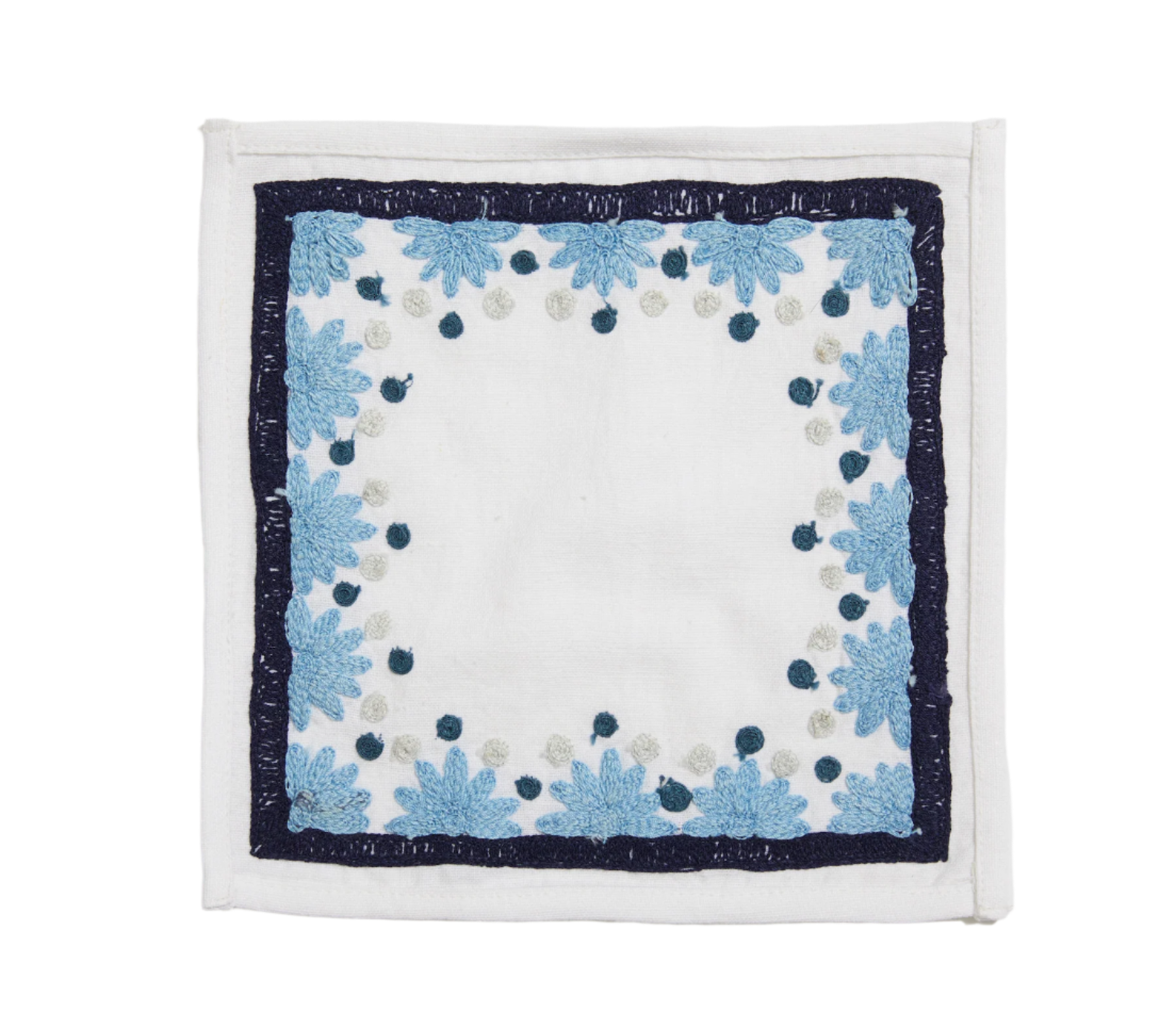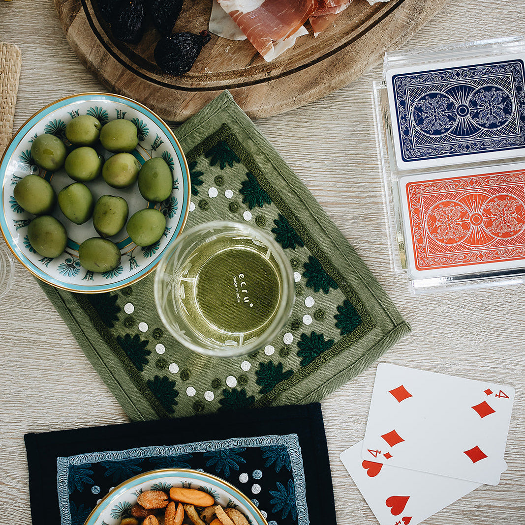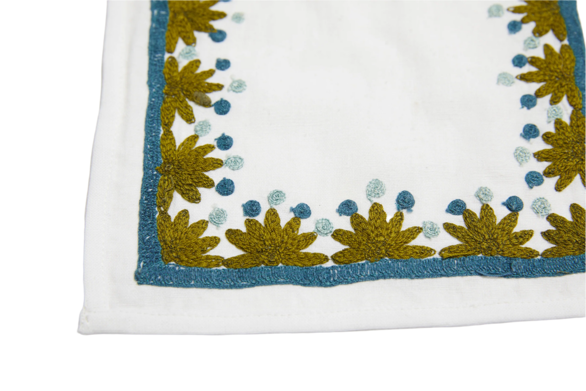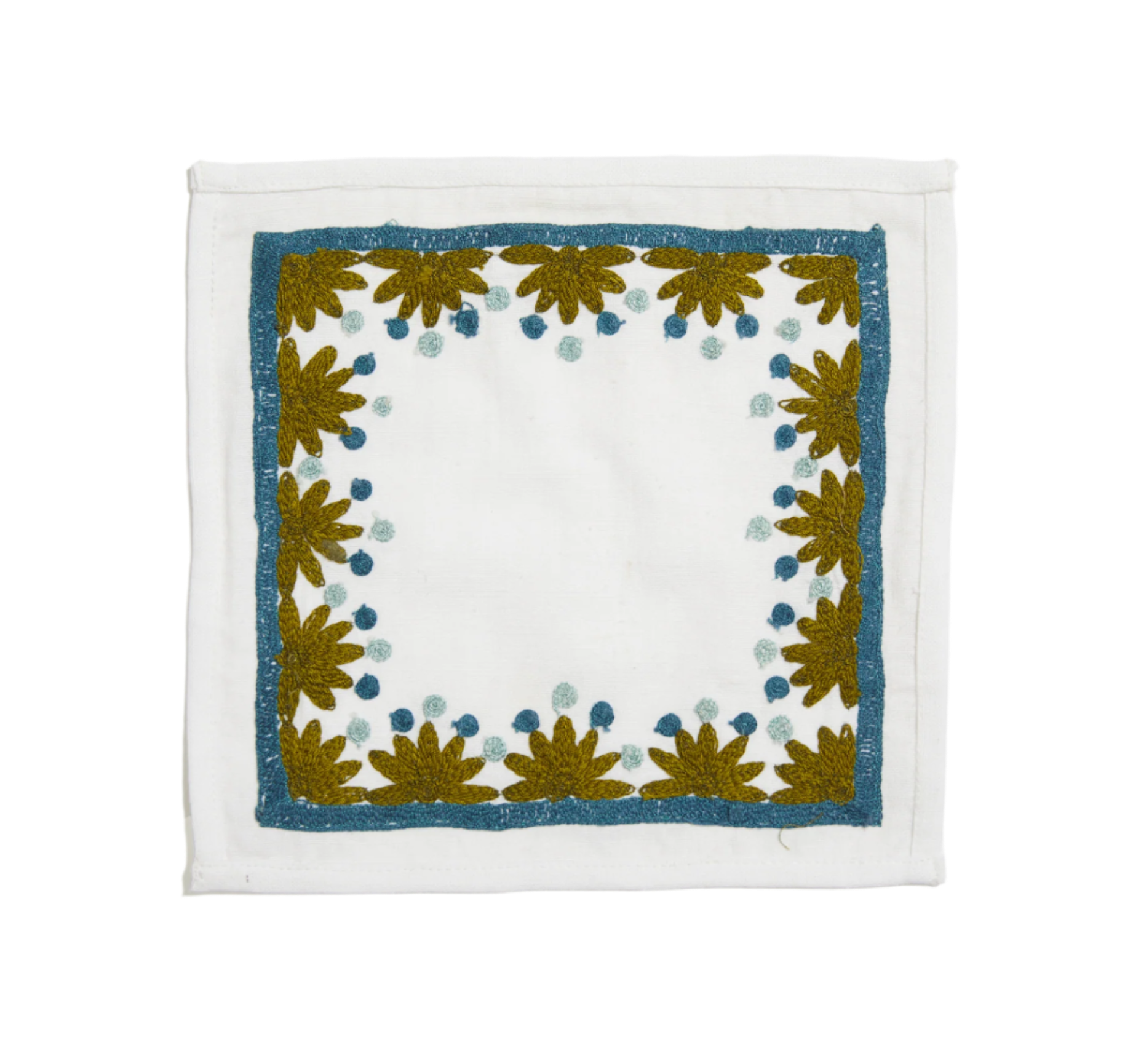 Our first cocktail napkin! Our Starburst design is created using an artisanal chain stitch embroidery technique. This embroidery resembles the techniques used to create original Suzani textiles. Colorful and sophisticated, our Starburst cocktail napkin add a punch of color to any summer table.