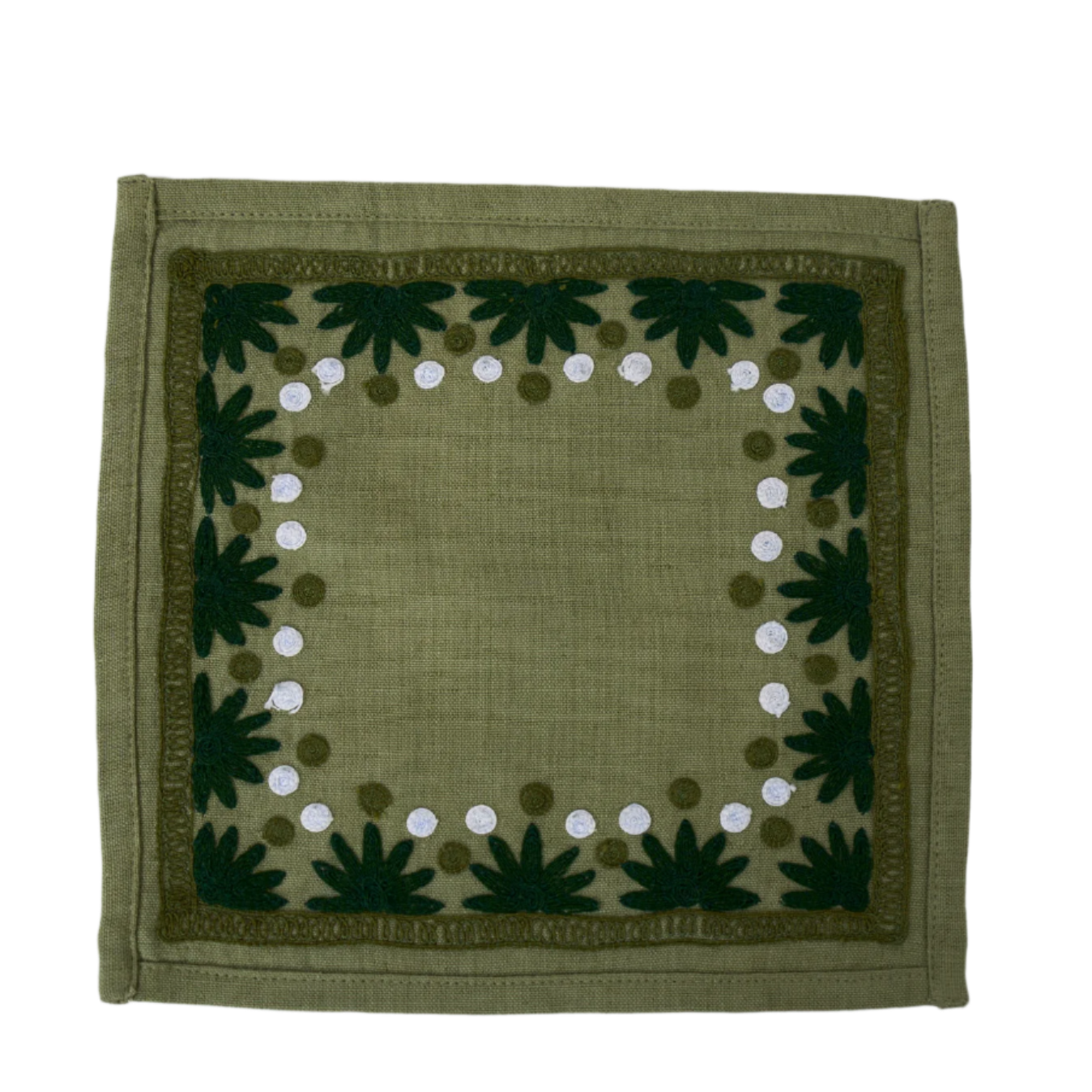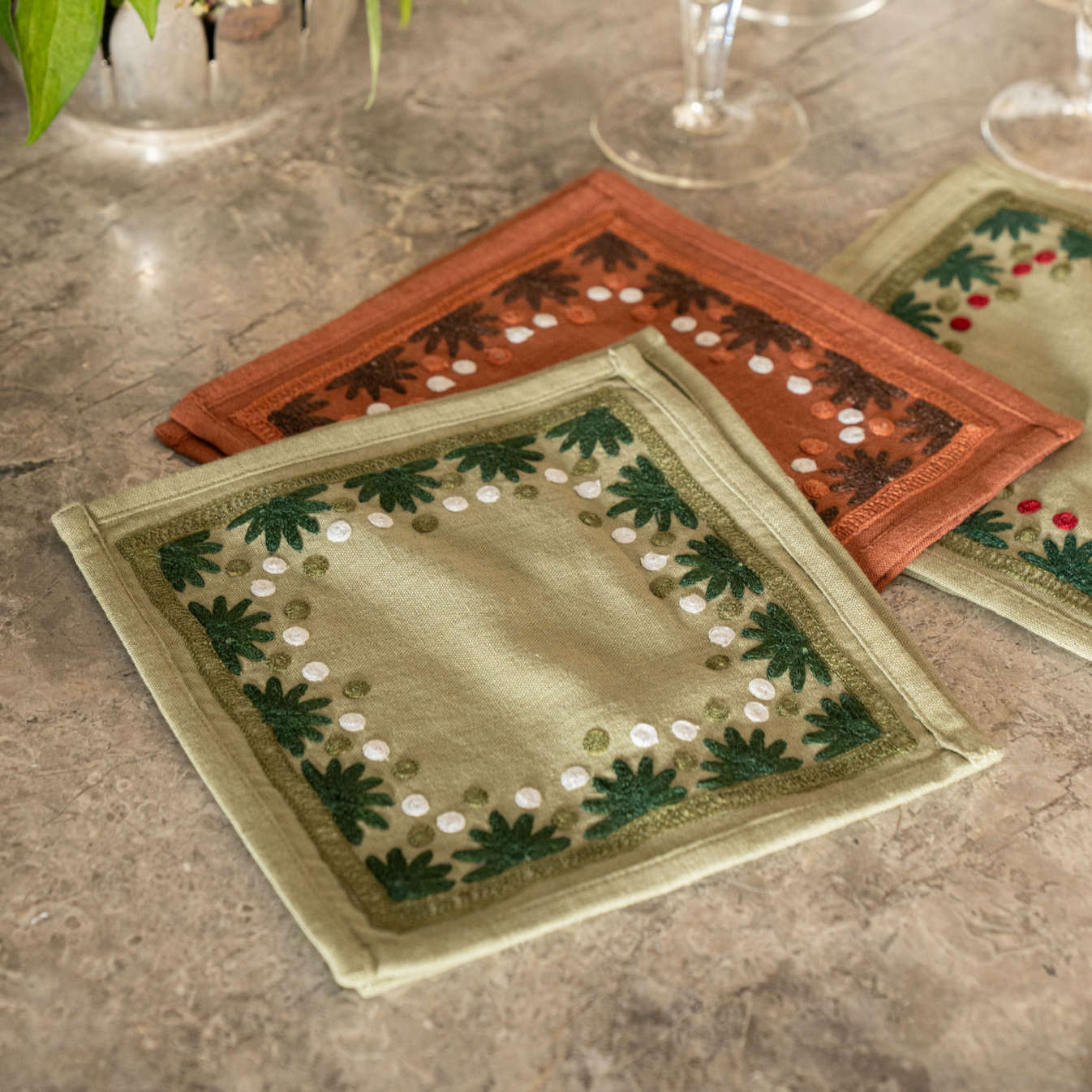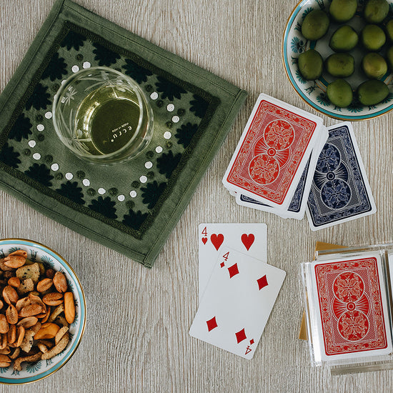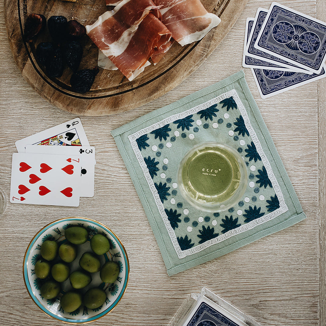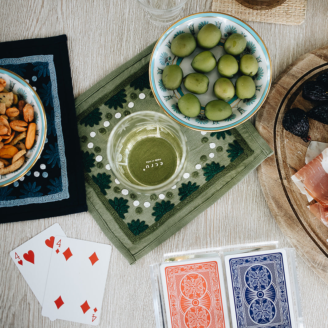 Our first cocktail napkin! Our Starburst design is created using an artisanal chain stitch embroidery technique. This embroidery resembles the techniques used to create original Suzani textiles. Colorful and sophisticated, our Starburst cocktail napkin add a punch of color to any summer table.